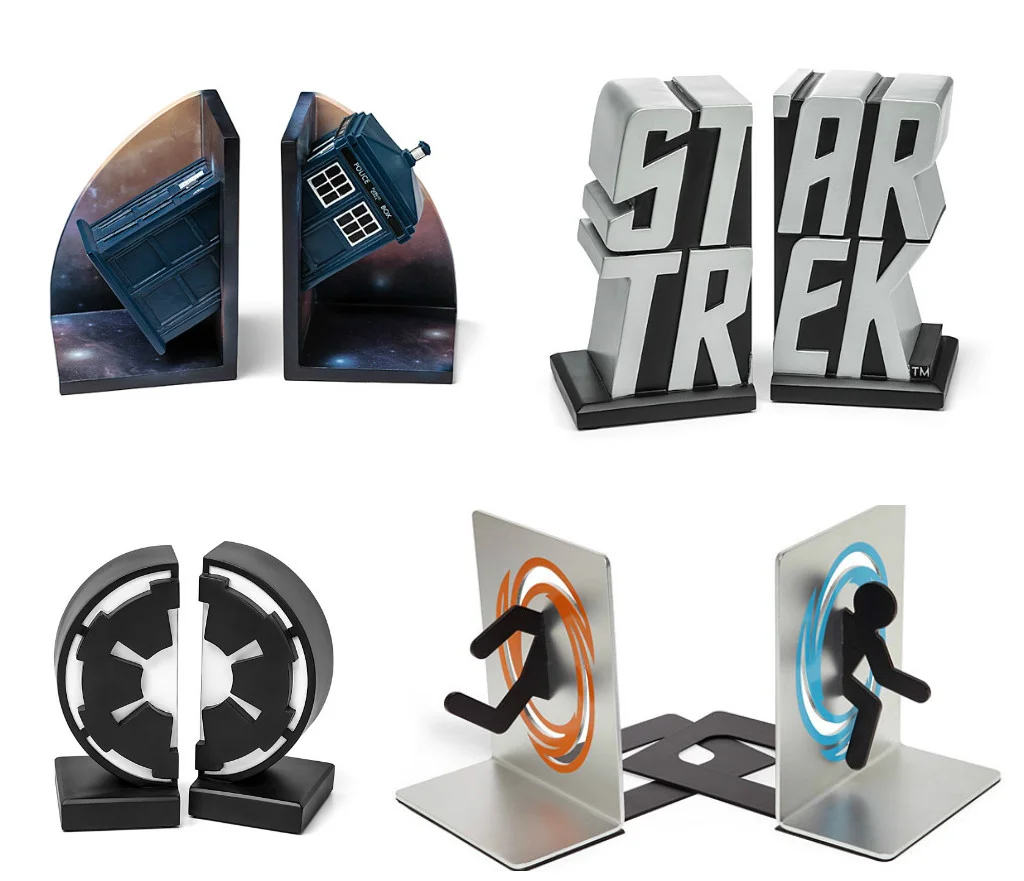 These delightfully nerdy bookends are available from Think Geek. From top right, clockwise: