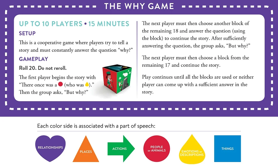 Of course, we had to give you an opportunity to join in on all of the fun. Here are the directions to The Why Game, one of the many activities in the book, and below you'll find a handful of blocks so you and your students can play along. Be sure to write down your story ideas or the stories you come up with and come back on Tuesday, 11/10 to share and read what others write too!