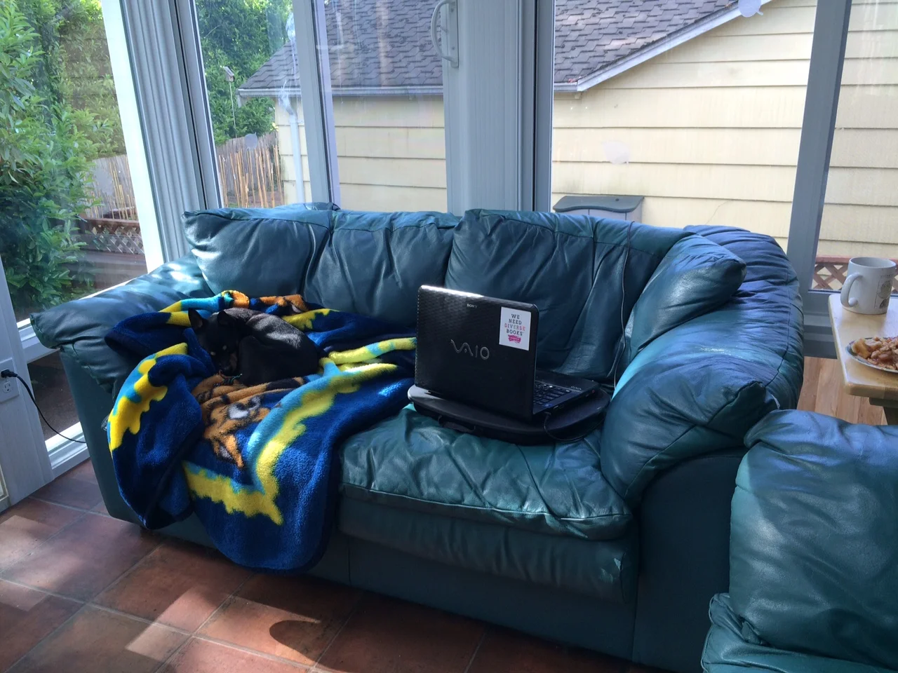 I am supposed to be working at my treadmill desk: it’s great exercise, helps my neck and back stay happy, has a super workstation setup, and actually boosts my creativity and productivity by keeping me moving. My assistant hates when I do that, however, so all too often she persuades me to sit on the big comfy couch in the sunroom with her instead.