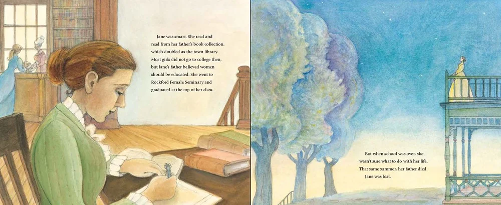 This is the story of Jane Addams, the first American woman to receive the Nobel Peace Prize, who transformed a poor neighborhood in Chicago by opening up her house as a community center.