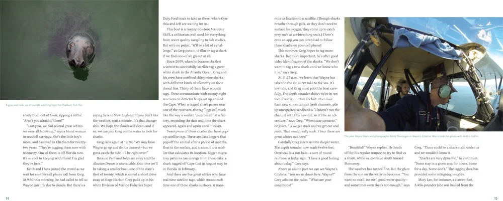 In typical fashion of the Scientist in the Field series, the book focuses on a particular scientist. In this case, Greg Skomal, a great white shark biologist, takes center stage. Another focus of the book is on the importance of understanding the needs of the great whites and their importance to understanding the needs of the ocean.