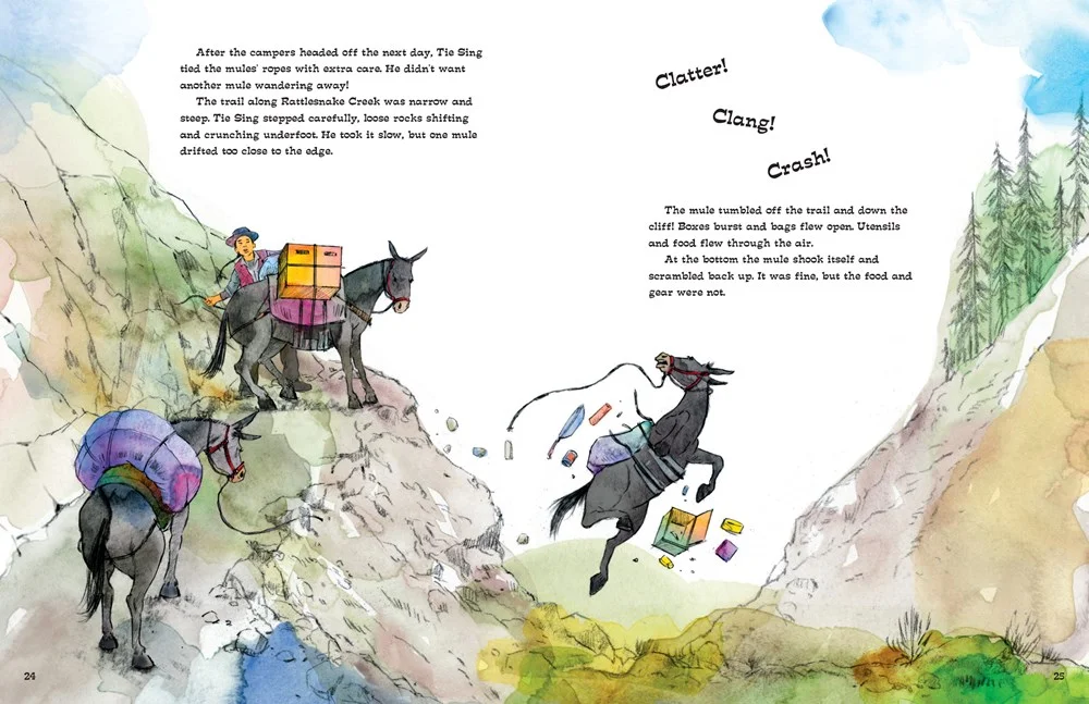 In celebration of the 100th anniversary of National Park Service, I am featuring Mountain Chef by Annette Bay Pimentel. Can you imagine lugging everything you need to cook basically gourmet meals (without modern amenities) in the mountains and do so on the backs of mules? A few years ago, I went camping with friends. We camped not far from the beach. We took care to weigh down coolers and to make sure food was secure and yet, by early morning raccoons had lifted one of the cooler lids enough to reach in and pull things out. However, in our case, we could drive a car into town to pick up anything that we needed. Tie Sing and his small crew didn't have those options so when things were lost, they were gone. It was a tough trip.