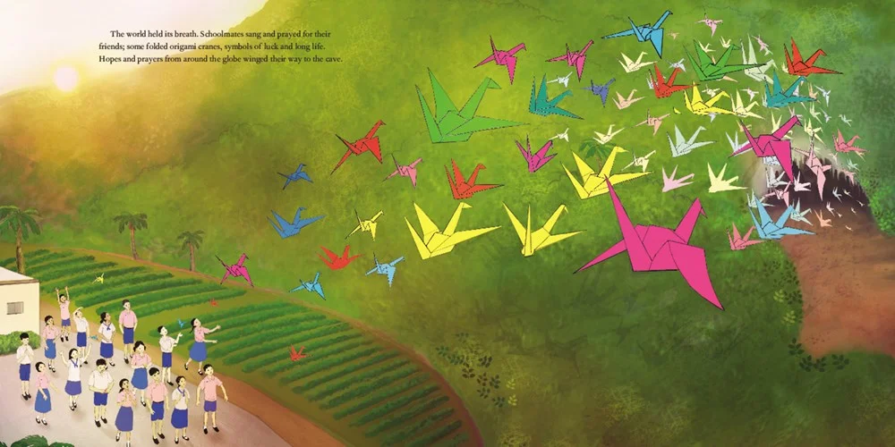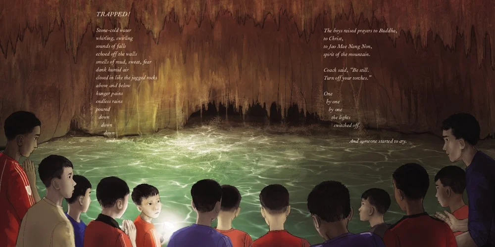 Susan Hood and Pathana Sorhiran share with young readers the 18 day rescue through the use of facts, free verse, the letters of the boys to family members, and quotes. Even though I was familiar with the story and new how it turned out, I still found myself getting a little anxious as it took longer and additional challenges arose in the attempts to rescue the boys.