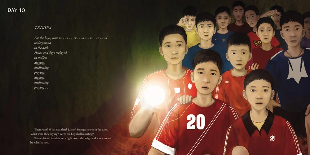 Description of the book: Follow the remarkable true story of eleven-year-old Titan, his teammates, and their soccer coach who went exploring the Tham Luang Caves in Chiang Rai, Thailand, only to become trapped inside by monsoon rains. This nonfiction picture book describes the world-wide teamwork that led to the boys’ daring rescue, written by acclaimed author Susan Hood in collaboration with respected reporter, Pathana Sornhiran, who witnessed the events first-hand.