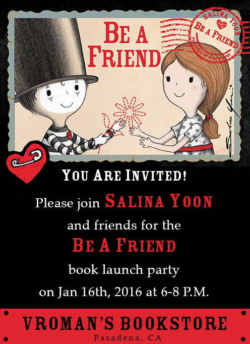 Several months ago, Salina Yoon reached out to Alethea (Read Now, Sleep Later) and I about helping with her book launch party. Of course, we were thrilled to be able to assist with this very special event. We quickly reached out to a number of our friends to create a planning committee and also reached out to Danielle and others wonderful booksellers at Vroman's Bookstore to provide a space for the event. After weeks and months of brainstorming and planning, we are so excited that BE A FRIEND is out in the wild for everyone to read. And we can't wait for a chance to celebrate with others in person.